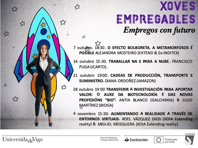 07-10-2021Dende a Área de Emprego e Emprendemento da Universidade de Vigo queremos seguir facilitando aos nosos estudantes e egresados/as a mellora da vosa empregabilidade cun novo ciclo de seminarios en liña. Nesta nova edición de XOVES EMPREGABLES imos dar a coñecer algunhas profesións, sen dubida de futuro, nos eidos virtuais e dixitais, economía verde, loxística, analista de negocios, marketing olfactivo, comunicación accesible, realidades 3D, ou arte, entre outros. Sectores todos que impactan de forma moi positiva no crecemento económico e no benestar da sociedade.