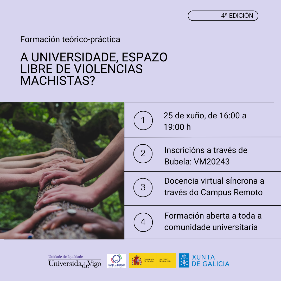 Docencia en liña síncrona, destinada a toda a comunidade universitaria da UVigo (PDI, PTXAS e estudantado), organizado pola Unidade de Igualdade e financiado polo Pacto de Estado contra a Violencia de Xénero e a Xunta de Galicia.