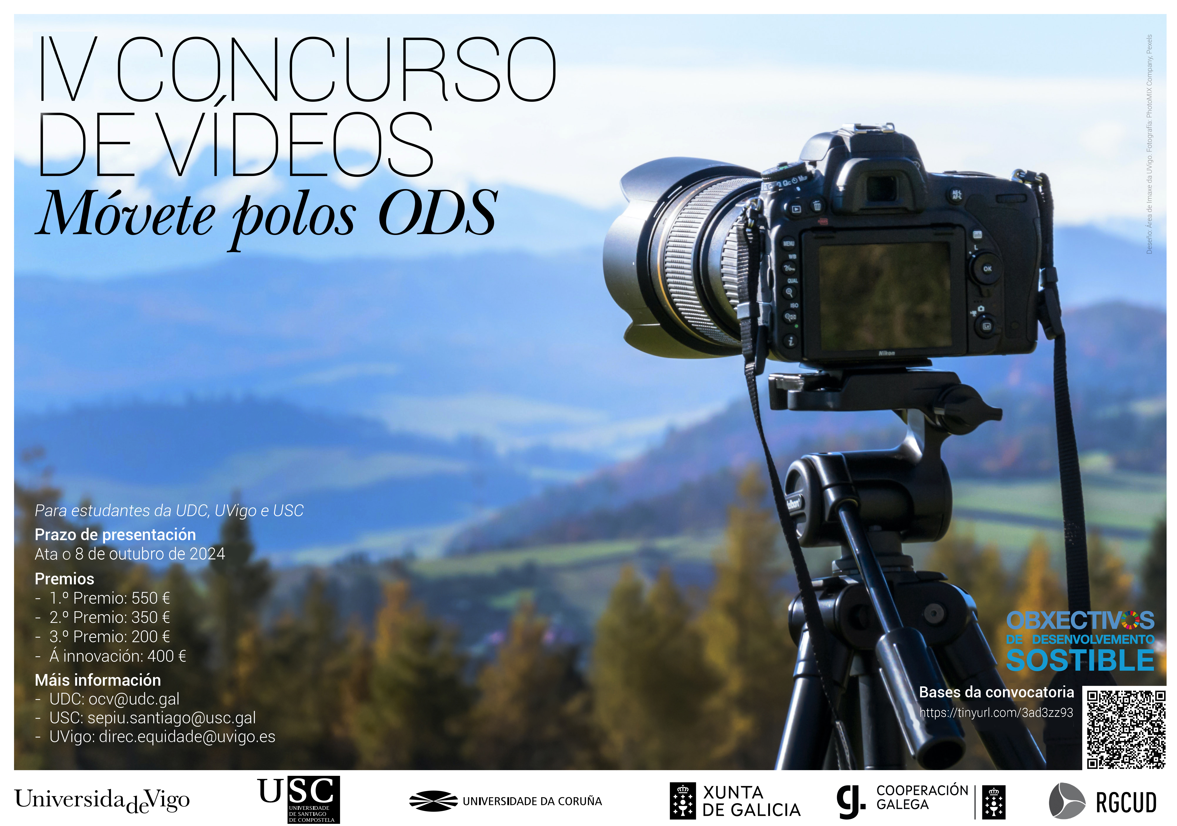 A Rede Galega de Cooperación Universitaria ao Desenvolvemento (RGCUD), convoca o IV Concurso de vídeos "MÓVETE POLOS ODS" co obxectivo de dar a coñecer os Obxectivos de Desenvolvemento sostible (ODS) de Nacións Unidas e sensibilizar á comunidade universitaria, e á sociedade en xeral, sobre a importancia de que todas as persoas formemos parte da solución aos grandes retos mundiais sobre a desigualdade, o cambio climático, a perda da biodiversidade, etc...