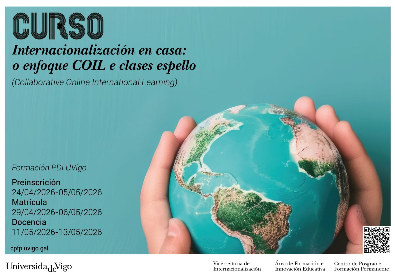Trátase dunha formación de 11 horas, en modalidade presencial e/ou en liña, dirixida ao profesorado da Universidade de Vigo interesado en integrar experiencias COIL nas súas materias.